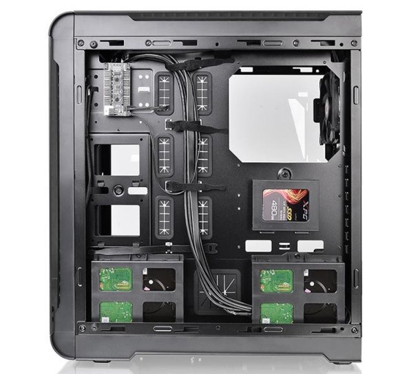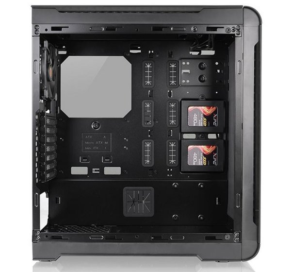 Корпус получил четыре панели из закалённого стекла толщиной 4 мм. Они располагаются в боковых частях, а также спереди и сверху. Комплект поставки включает три 120-мм вентилятора Riing LED RGB с многоцветной подсветкой: два размещены во фронтальной зоне, ещё один — сзади.