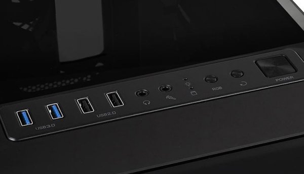 На панели с разъёмами в верхней части располагаются по два порта USB 3.0 и USB 2.0, гнёзда для наушников и микрофона. Весит корпус 8,2 кг.