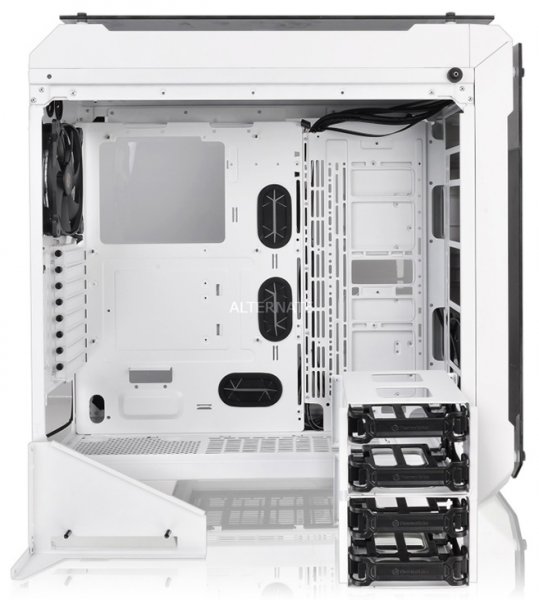 Для монтажа радиаторов СЖО предусмотрены посадочные места на лицевой, задней, верхней и нижней панелях. Кроме того, один теплорассеиватель можно закрепить справа от материнской платы. Thermaltake View 71 TG Snow допускает размещение радиаторов СЖО типоразмеров 120, 140, 240, 280, 360 и 420 мм. Для удобства сборки ПК в корпусе имеются корзины для жёстких дисков и SSD. Сетчатые фильтры будут препятствовать накоплению пыли в блоке питания, на поверхности радиаторов СЖО и других комплектующих.