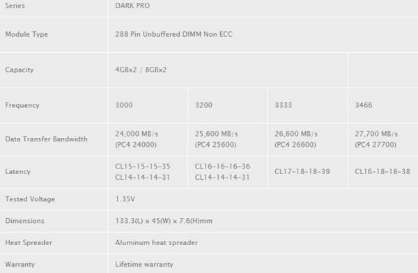 Покупатели смогут выбирать между наборами на основе модулей с частотой 3000, 3200, 3333 и 3466 МГц. Напряжение питания во всех случаях составляет 1,35 В. С таймингами можно ознакомиться в таблице ниже.