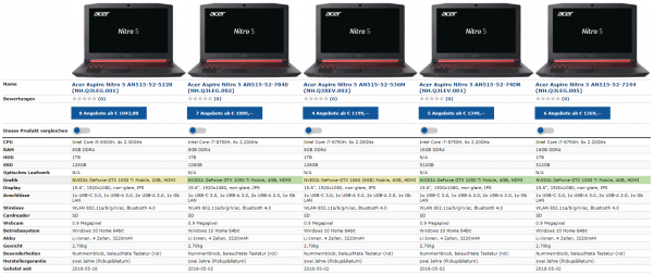 Модель на основе шестиядерного CPU Core i7-8750H (2,2/4,2 ГГц) и графического адаптера GeForce GTX 1060 с 6 Гбайт буферной памяти GDDR5 предлагается на западноевропейском рынке по цене от €1199. Учитывая толщину корпуса ноутбука как минимум в 26,7 мм, геймеры вправе рассчитывать на полноценную (а не Max-Q) версию GTX 1060 в конфигурации AN515-52-536M. Более дорогие модели, стоимостью от €1349-1369, оснащены 16 Гбайт оперативной памяти и 512-Гбайт SSD-накопителем, тогда как вариант с производительной дискретной графикой ограничивается «всего лишь» 8 Гбайт RAM и 128-Гбайт загрузочным SSD в паре с 1-Тбайт жёстким диском.