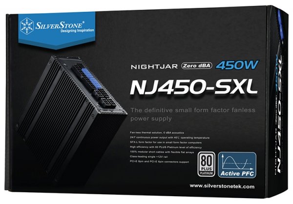 Компания SilverStone известна своими экспериментами по выпуску нестандартных источников питания. На этот раз тайваньский производитель порадовал поклонников безвентиляторным блоком питания Nightjar NJ450-SXL форм-фактора SFX-L (125 ? 130 ? 63,5 мм). Устройство выделяется не только небольшими габаритами и модульным принципом подключения кабелей, но и применением корпуса-радиатора. Он, с одной стороны, отводит тепло от силовых элементов, а с другой — может препятствовать распространению посторонних шумов от узлов БП, которые иногда присутствуют у «абсолютно бесшумных» источников питания.