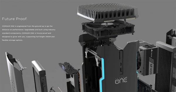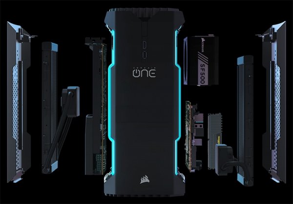 Изюминкой десктопа One от компании Corsair является его относительно компактное (200 ? 176 ? 381 мм) исполнение в сочетании с внушительным подбором узлов. Заметим, что данный системный блок явно создавался под влиянием Apple Mac Pro, но, в отличие от последнего, занял нишу игровых ПК high-end-класса — наряду с Alienware Area-51, MSI Vortex G-Series и другими системами необычного внешнего вида.