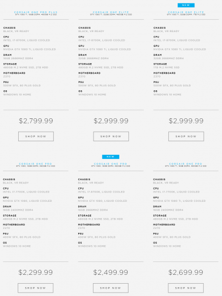 К двум имеющимся комплектациям One Pro присоединился десктоп с процессором Core i7-8700K. Относительно собратьев с четырёхъядерным Core i7-7700K на борту он оснащён более быстрой памятью (эффективные 2666 МГц против 2400 МГц), но вместе с тем уступает старшему One Pro по производительности графической подсистемы (GeForce GTX 1080 против GeForce GTX 1080 Ti). Объём установленной RAM составляет 16 Гбайт, дуэт накопителей образован M.2 SSD на 480 Гбайт и жёстким диском на 2 Тбайт. За питание системы отвечает 400-Вт БП Corsair того же формата, что и вышеупомянутая 500-Вт модель. Американская компания оценила новый вариант One Pro в $2499,99.