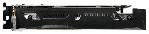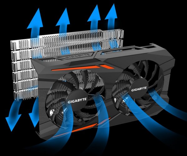 Новинка выполнена в виде небольшой (191 ? 111 мм) карты расширения, оснащённой двухслотовым кулером. Система охлаждения WindForce 2X состоит из цельного алюминиевого радиатора и кожуха с двумя 80-мм вентиляторами. «Пропеллеры» полностью останавливаются при невысокой температуре GPU. Шестиконтактный разъём дополнительного питания в Gigabyte GeForce GTX 1050 OC 3G не предусмотрен — в этом можно убедиться, взглянув на следующий маркетинговый эскиз устройства.