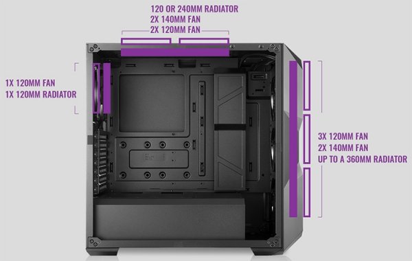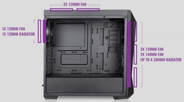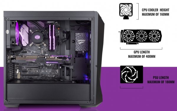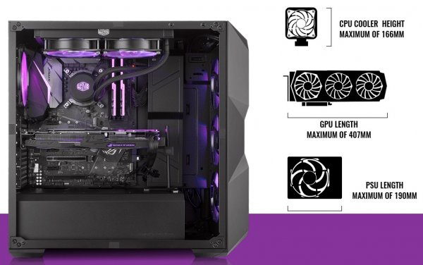 Возможности MasterBox K500 и TD500 в плане размещения комплектующих вполне сопоставимы. Так, TD500 допускает установку платы ATX, Micro-ATX или Mini-ITX, CPU-кулера высотой до 160 мм, семи карт расширения, блока питания длиной до 180 мм, двух жёстких дисков и одного-шести накопителей форм-фактора 2,5 дюйма. Конфигурацию можно дополнить ещё тремя вентиляторами (120- и/или 140-мм), а также двумя радиаторами СЖО — 120-мм и 120–280-мм.