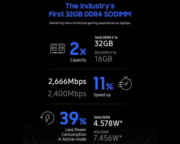 Компания Samsung Electronics сообщила о начале массового производства первых в отрасли модулей оперативной памяти DDR4 SODIMM ёмкостью 32 Гбайт, которые рассчитаны на применение в игровых портативных компьютерах.