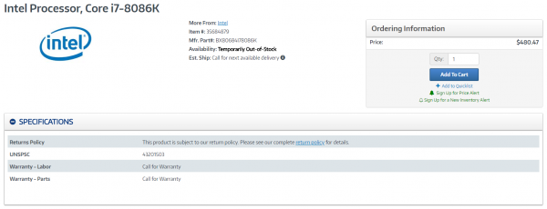 И Merlion, и Connection привели лишь некоторые спецификации Core i7-8086K. В коробочной версии данный процессор носит обозначение BX80684I78086K и поставляется без кулера в комплекте. Рабочая частота CPU варьируется от 4,0 до 5,0 ГГц — в зависимости от характера нагрузки. В качестве графического адаптера используется привычный для настольных Core i3/i5/i7-8000 интегрированный блок UHD Graphics 630. Предварительный заказ нового процессора обойдётся американским энтузиастам в $480, без налога с продаж. «Аппетиту» Connection можно только позавидовать, ведь и немногим более медленный Core i7-8700K стоит в том же магазине внушительные $412.