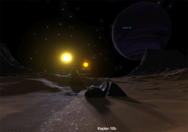 Планета Kepler-16b интересна тем, что находится около двойной звезды: одно из этих светил представляет собой оранжевый карлик, а второе является красным карликом.