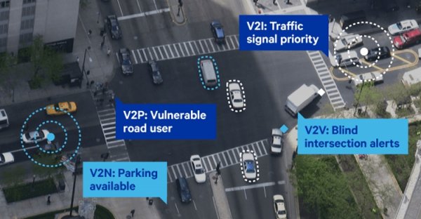 Речь идёт о платформе Cellular Vehicle-to-Everything, или C-V2X. Она предполагает передачу данных через сети четвёртого (LTE) и пятого (5G) поколений. Система C-V2X позволит автомобилям общаться друг с другом (средства V2V), а также с объектами дорожной инфраструктуры (V2I).