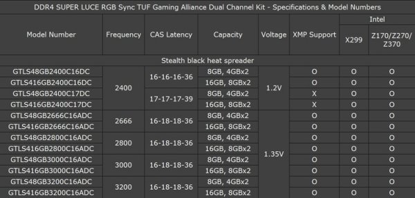 Семейство Super Luce RGB Sync Series TUF Gaming Alliance включает модули с частотой от 2400 до 3200 МГц. Напряжение питания составляет 1,2 или 1,35 В. Память поддерживает технологию XMP 2.0, что облегчает разгон.
