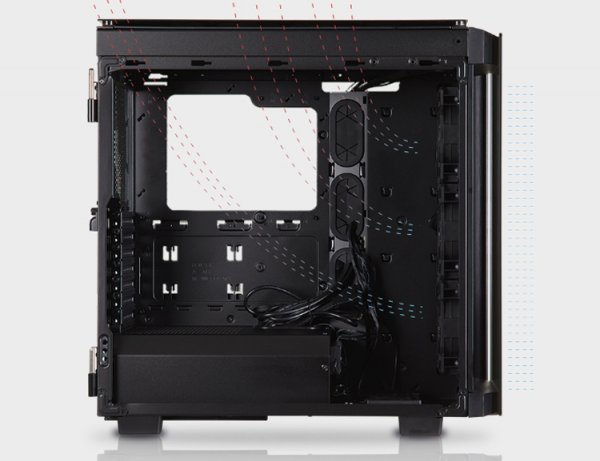 При использовании жидкостной системы охлаждения пользователи смогут монтировать радиаторы спереди, сверху и сзади. Длина таких компонентов может варьироваться от 120 до 360 мм. Высота процессорного кулера не должна превышать 170 мм.