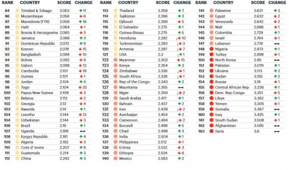 При составлении рейтинга исследователи учитывали уровень сплоченности общества, соблюдение прав человека, уровень террористической угрозы, а также насколько стабильно экономическое и политическое положение в стране.
