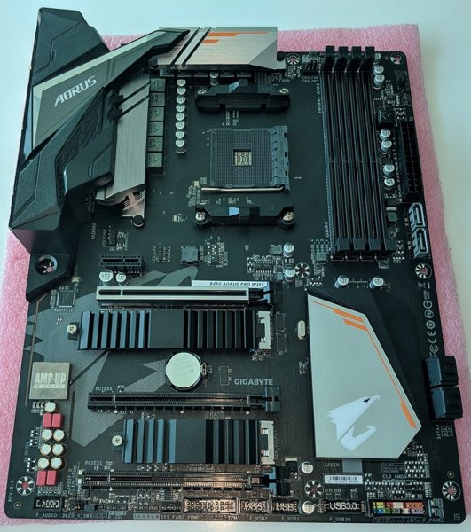 Несмотря на внушительные габариты, у B450 Aorus Pro WiFi предусмотрено только четыре слота для карт расширения PCI Express. Верхний работает в режиме x1, ниже него расположились усиленный металлической рамкой PCI Express 3.0 x16, полноразмерные PCI Express 2.0/3.0 x16@x4 и PCI Express 2.0/3.0 x16@x1. Среди штырьковых разъёмов выделим USB 3.0, разъёмы для светодиодных лент и помп СЖО. Аудиоподсистема материнской платы основана на 8-канальном аудиокодеке (скорее всего, Realtek ALC1220) и включает «аудиоконденсаторы» и усилитель для наушников. Наряду с интерфейсом Gigabit Ethernet новинка оснащена комбинированным адаптером Wi-Fi/Bluetooth.