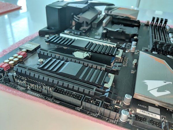 Gigabyte Technology привезла на Computex 2018 одну материнскую плату с разъёмом AM4, но, как минимум внешне, она способна дать фору подавляющему большинству конкурирующих продуктов. Устройство получило имя Gigabyte B450 Aorus Pro WiFi, его форм-фактор легко угадывается — ATX. Производитель не пожалел металла на пять радиаторов: верхние охлаждают транзисторы области VRM, нижние — чипсет и M.2-накопители (если, конечно, в системе буду установлены два M.2 SSD).