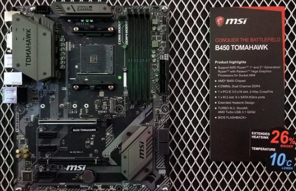 Завершает наш рассказ о прототипах матплат на чипсете AMD B450 подборка моделей в исполнении Micro-Star International. Таковых собственно две — MSI B450 Tomahawk и B450-A Pro. Первая сопровождается слоганом «Покоряй поле битвы» и относится к категории геймерских продуктов, вторая, как утверждается, «крепче стали» и выглядит попроще. И та, и другая платы выполнены в форм-факторе ATX.