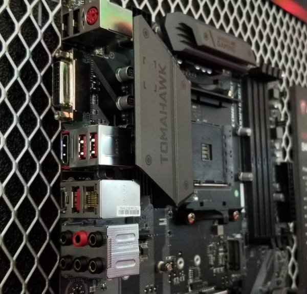 Для B450 Tomahawk заявлено 26 % увеличение площади радиаторов VRM и снижение температуры транзисторов в цепях питания разъёма AM4 на 10 °С (вероятно, в сравнении с B350 Tomahawk). Данный шаг можно только приветствовать, хотя мы всё ещё ждём повторного пришествия в качестве VRM-охладителей простых пластинчатых или игольчатых алюминиевых радиаторов без покраски.