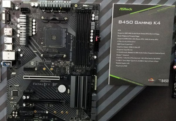 Модель ASRock B450 Gaming K4 форм-фактора ATX позволит подключить шесть карт расширения PCI Express, в том числе две видеокарты AMD Radeon (CrossFire по схеме «x16 + x4») или одну NVIDIA GeForce. Ещё одной интересной особенностью новинки является возможность установки двух M.2 SSD, правда, пропускная способность нижнего разъёма ограничена 20 Гбит/с. На плате реализована «6 + 3»-фазная система питания гнезда AM4 и имеются три радиатора, причём чипсетный выглядит крупнее двух VRM-охладителей вместе взятых.