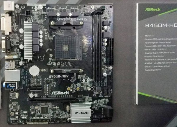Материнская плата ASRock B450M-HDV выполнена в форм-факторе Micro-ATX. Она представляет собой бюджетное решение с нестандартным нижним расположением микросхемы и радиатора чипсета, 4-контактным дополнительным разъёмом питания (ATX12V) вместо 8-контактного (EPS12V) и одним радиатором для транзисторов VRM вместо двух. Скромный арсенал прототипа B450M-HDV включает «4 + 3» фазы питания гнезда AM4, два разъёма для модулей памяти DIMM DDR4-2133/.../3200, единичные слоты для карт расширения PCI Express x16 и PCI Express x1, четыре порта SATA 6 Гбит/с и слот Ultra M.2 с пропускной способностью 32 Гбит/с.