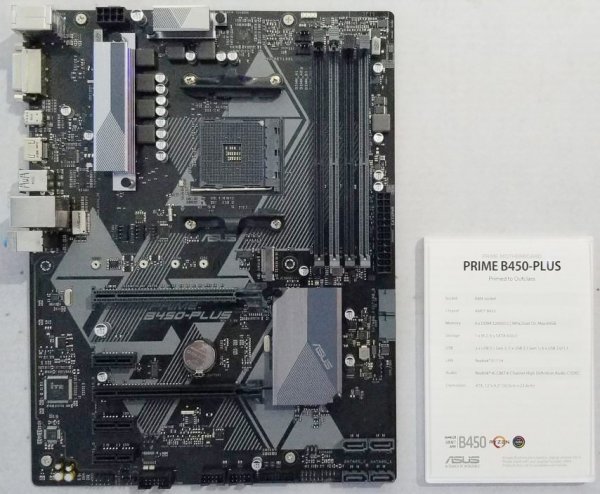 Желающие немного сэкономить могут обратить внимание на материнскую плату ASUS Prime B450-Plus того же форм-фактора (ATX). Она практически лишена внешних изысков и обходится без многих компонентов, которые имеются у ROG Strix B450-F Gaming — пары фаз питания гнезда AMD AM4, массивных радиаторов VRM (форма теплосъёмников в целом оставляет желать лучшего), нижнего слота PCI Express x16 (работает как x4 или x1), одного из разъёмов M.2, оригинальной RGB-подсветки, кожуха задней панели и видеовыхода DisplayPort.
