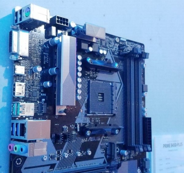 Компания ASUSTeK Computer привезла на домашнюю выставку три материнские платы AM4/B450 — ROG Strix B450-F Gaming, Prime B450-Plus и Prime B450M-A. Выбором геймеров и энтузиастов с тугим кошельком наверняка будет представительница семейства ROG Strix. Она выполнена в форм-факторе ATX и выделяется наличием трёх слотов для видеокарт, системы RGB-подсветки ASUS Aura и аудиоподсистемы SupremeFX S1220A. Транзисторы «4 + 4»-канальной схемы питания гнезда AM4 охлаждаются двумя радиаторами. Задняя панель I/O накрыта декоративным кожухом с логотипом серии.
