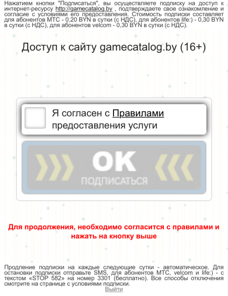 1. Поставить галочку в чек-боксе — окне с текстом „Я согласен с правилами предоставления услуги“ — тем самым подтверждая, что он ознакомлен и согласен с установленными правилами. Ссылка на правила размещена на той же странице. Если абонент не желает воспользоваться услугой, необходимо покинуть страницу или воспользоваться кнопкой „Выйти/Назад“.