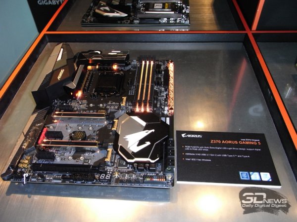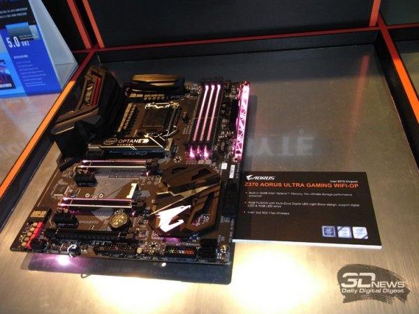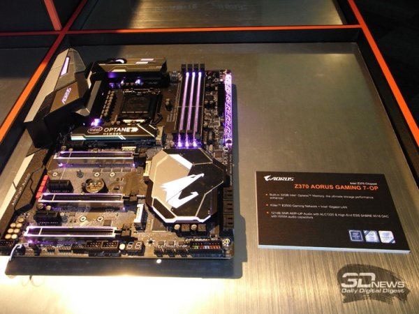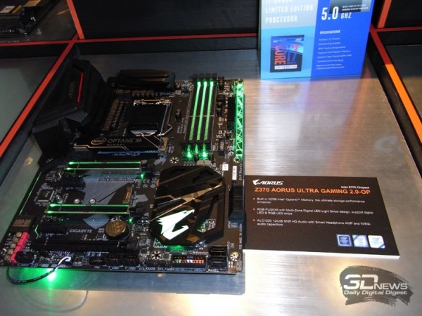 На стенде Aorus можно увидеть системные платы с приставкой «ОР» в обозначении: это, к примеру, модели Z370 Aorus Gaming 7-OP, Z370 Aorus Ultra Gaming WIFI-OP и Z370 Aorus Ultra Gaming 2.0-OP. Особенность этих изделий заключается в том, что вместе с ними поставляется передовой модуль памяти Intel Optane вместимостью 32 Гбайт. Его наличие позволяет существенно повысить производительность подсистемы хранения данных.