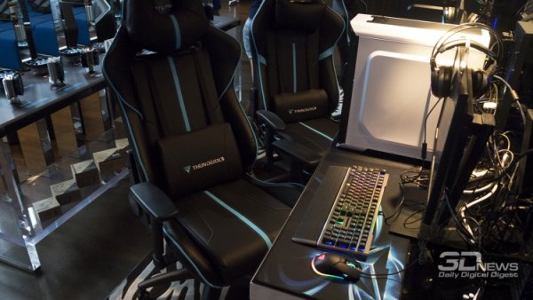 Так, при входе в выставочную зону мы сразу же натолкнулись на компьютерный стол. Такие устройства в скором времени появятся в продаже как под маркой Aerocool, так и под брендом THUNDERX3. Столы могут быть разные — разных размеров, а также разной конструкции. Например, на фотографии выше показана модель Aerocool, которая регулируется по высоте нажатием всего пары кнопок. За таким столом вы можете работать даже стоя. Не знаем, насколько это полезно геймерам, но вот собирать ПК в таких условиях становится гораздо проще — не надо горбатиться.