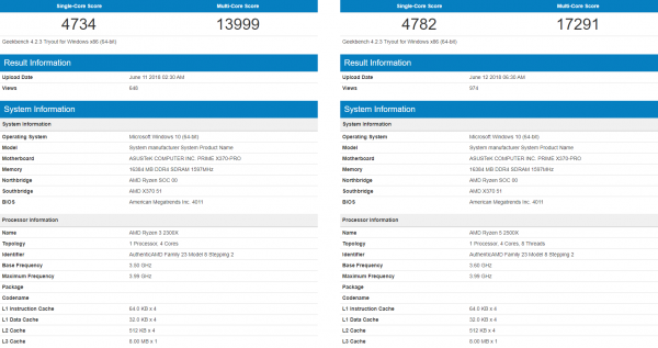 Блок информации о системе содержит упоминания о материнской плате ASUS Prime X370-Pro, оперативной памяти DDR4-3200 общим объёмом 16 Гбайт и ОС Windows 10. Частоты модели Ryzen 3 2300X определились как 3,5/4,0 ГГц (номинальная/boost-режим), а значения для Ryzen 5 2500X составили 3,6/4,0 ГГц. Приложение Geekbench 4 в целом не отличается высокой точностью считывания характеристик CPU, что в данном случае подтверждается якобы вдвое меньшим объёмом кеш-памяти третьего уровня у Ryzen 5 2500X (8 Мбайт) относительно Ryzen 5 1500X (16 Мбайт).