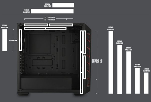 Допускается применение воздушной или жидкостной системы охлаждения. В первом случае возможен монтаж до шести вентиляторов, а во втором — поддерживается установка радиаторов формата до 360 мм.