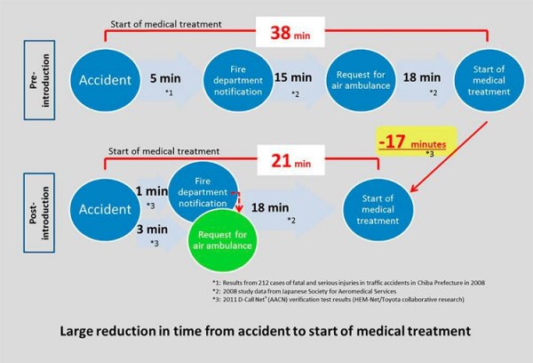 В Японии в национальном масштабе запущена передовая платформа D-Call Net, задача которой заключается в том, чтобы максимально ускорить оказание помощи людям, пострадавшим в дорожно-транспортных происшествиях (ДТП). В проекте по развёртыванию системы приняли участие компании Honda Motor и Toyota Motor, японская служба спасения и Сертифицированная некоммерческая организация — Экстренная медицинская сеть вертолётов и больниц (HEM-Net). Платформа D-Call Net обеспечивает связь с сервисами больниц и баз воздушной скорой помощи с целью оперативной передачи информации о смертельных дорожных происшествиях или авариях с пострадавшими. Утверждается, что система снижает задержки оказания помощи в среднем на 17 минут. Тестирование платформы началось ещё осенью 2015 года. В начале пробного периода сервис объединил 10 госпиталей в 9 японских префектурах. Сейчас же в системе работают 42 клиники и 37 авиабаз скорой помощи в 31 префектуре. Это примерно 70 % всех экстренных служб страны. В дальнейшем к проекту присоединятся компании Bosch Service Solutions и Premier Aid. В результате, технология должна распространиться на большинство автомобилей Японии, в том числе и на импортированные модели. Нужно отметить, что система с аналогичным предназначением действует и в России — это сервис «ЭРА-ГЛОНАСС». В автомобили для российского рынка устанавливается специальный модуль, который в случае аварии автоматически определяет и в режиме приоритизации вызова передаёт оператору информацию о точных координатах, времени и тяжести ДТП. Эти сведения затем поступают в экстренные оперативные службы.