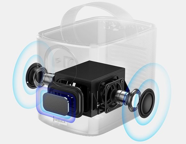 Проектор наделён аудиосистемой с двумя 10-ваттными динамиками, которая выдаёт довольно качественный звук с насыщенными низкими частотами. Встроенная аккумуляторная батарея ёмкостью 12 500 мА·ч обеспечивает до четырёх часов автономной работы.