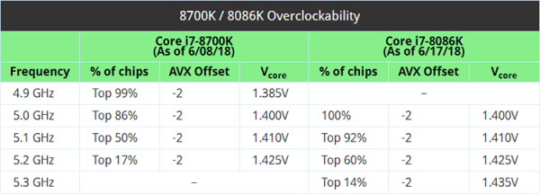 Опыт Silicon Lottery показал, что Core i7-8086K в среднем превосходит Core i7-8700K по показателю максимальной частоты в разгоне. Так, 60 % чипов с индексом 8086K способны достичь отметки 5,2 ГГц и 14 % — 5,3 ГГц. В то же время половина процессоров Core i7-8700K способна работать только на 5,1 ГГц и лишь немногие — на 5,2 ГГц. Для рядового пользователя разница в 100–200 МГц не играет особой роли, а вот любителям разгона Core i7-8086K должен понравиться больше.