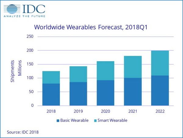 Компания International Data Corporation (IDC) сделала прогноз по мировому рынку носимых устройств на период до 2022 года: аналитики полагают, что отрасль будет демонстрировать устойчивый рост. Данные IDC учитывают поставки смарт-часов с базовой и расширенной функциональностью, различных фитнес-трекеров, а также устройств, крепящихся на одежду, и ушных изделий. По прогнозам экспертов IDC, в текущем году по всему миру будет реализовано приблизительно 124,9 млн носимых устройств. Рост по отношению к прошлому году составит примерно 8,2 %. В 2022 году объём рынка в штучном выражении, по мнению аналитиков, составит 199,8 млн единиц. Таким образом, показатель CAGR (среднегодовой темп роста в сложных процентах) в период 2018–2022 гг. окажется на уровне 12,5 %. Самыми востребованными гаджетами будут оставаться смарт-браслеты и наручные часы с расширенной функциональностью. Их отгрузки в нынешнем году составят соответственно 45,1 млн и 43,5 млн штук, рыночные доли — 36,1 % и 34,8 %. Поставки «умных» часов с базовой функциональностью в текущем году составят 29,6 млн единиц (23,7 %). На все прочие типы носимых изделий в нынешнем году, согласно прогнозам IDC, придётся 5,4 % в общей массе поставок, или 6,8 млн штук.