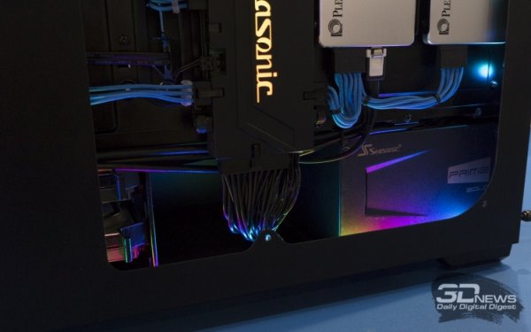 Стенд компании условно был разделен на две части. На одной демозоне представители Seasonic показали свои индустриальные блоки питания, а на другой стороне — потребительскую компьютерную технику. При этом помещение было украшено несколькими красочными проектами ПК. Естественно, при участии блоков питания Seasonic. Кстати, если вы хотите виртуально побывать на стенде Seasonic, то зайдите на этот сайт. В демозоне, посвященной индустриальным продуктам, Seasonic показала несколько весьма эффективных моделей, которые имеют сертификат 80 PLUS Platinum. В состав промышленных блоков питания входят различные форм-факторы Intel, включая ATX, TFX. Были показаны и устройства типоразмеров 1U, 2U и Flex, которые предназначены для использования в серверном оборудовании. Конечно же, зона с блоками питания для настольных компьютеров выглядела заметно более красочнее. Просто потому, что в 2018 году даже такие устройства должны выглядеть презентабельно. Мы уже писали про тренды Computex 2018 — это прозрачные корпуса, много стекла и подсветки. Нравится вам это или нет, но таковы тенденции в мире домашних компьютеров. Не все устройства компании можно считать новинками. Среди потребительских продуктов были представлены хорошо нам знакомые и популярные в России серии PRIME, FOCUS, M12II и S12II. Однако несколько интересных новинок «выцепить» всё же удалось. Так, отдельный столик был выделен под блоки питания серий Snow Silent и PRIME Air Touch. К «снежной» категории относятся модели мощностью 550, 650 и 750 Вт соответственно. При этом младшая модель сертифицирована по стандарту 80 PLUS Gold, средняя — по 80 PLUS Platinum, а флагманская — по 80 PLUS Titanium. Естественно, наибольший интерес представляет самый мощный блок питания серии. В конструкции этого БП используется 135-мм вентилятор с гидродинамическим подшипником. При загрузке устройства до 40 % крыльчатка не вращается вообще, а затем начинает потихоньку раскручиваться. Производитель заверяет, что уровень шума блока питания не превышает 20 дБ. При этом сомневаться в надежности устройства не приходится — Seasonic даёт 12-летнюю гарантию на свою продукцию. Модель PRIME Air Touch мощностью 850 Вт поддерживает стандарт 80 PLUS Gold и тоже имеет полностью модульный кабель-менеджмент. За охлаждение компонентов блока питания тоже отвечает 135-мм вентилятор с гидродинамическим подшипником. При этом «карлсон» имеет пять режимов работы: turbo, high cooling mode, medium cooling mode, low cooling mode и silent. Как видите, устройство можно использовать в различных условиях. Естественно, на эту модель распространяется 12-летняя гарантия. А ещё на выставке Seasonic показала свой передовой блок питания форм-фактора SFX-L, который подойдет для сборки компактных игровых систем. Модель FOCUS SGX-650, как видно из названия, обладает честными 650 ваттами и сертифицирована согласно стандарту 80 PLUS Gold. При этом блок имеет полностью модульный кабель-менеджмент. За охлаждение компонентов FOCUS SGX-650 отвечает 120-мм вентилятор на гидродинамическом подшипнике. Гарантия на устройство — 10 лет. Пожалуй, самой главной и интересной новинкой Seasonic стал модуль SCMD (System Cable Management Device). Он призван заметно упростить сборщикам системных блоков жизнь, да и помочь организовать аккуратный кабель-менеджмент в корпусе. Сейчас абсолютное большинство компьютерных кейсов имеет посадочное место для блока питания внизу. Для более простого подключения кабелей и разработано это устройство.