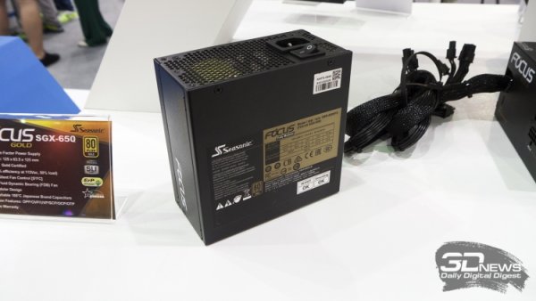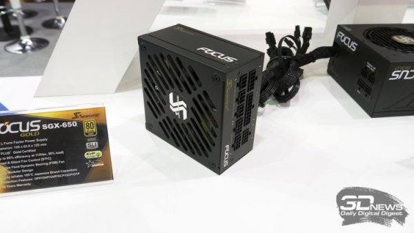 А ещё на выставке Seasonic показала свой передовой блок питания форм-фактора SFX-L, который подойдет для сборки компактных игровых систем. Модель FOCUS SGX-650, как видно из названия, обладает честными 650 ваттами и сертифицирована согласно стандарту 80 PLUS Gold. При этом блок имеет полностью модульный кабель-менеджмент. За охлаждение компонентов FOCUS SGX-650 отвечает 120-мм вентилятор на гидродинамическом подшипнике. Гарантия на устройство — 10 лет.