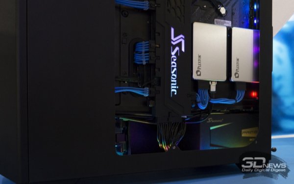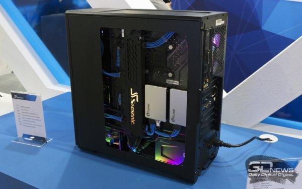 Стенд компании условно был разделен на две части. На одной демозоне представители Seasonic показали свои индустриальные блоки питания, а на другой стороне — потребительскую компьютерную технику. При этом помещение было украшено несколькими красочными проектами ПК. Естественно, при участии блоков питания Seasonic.