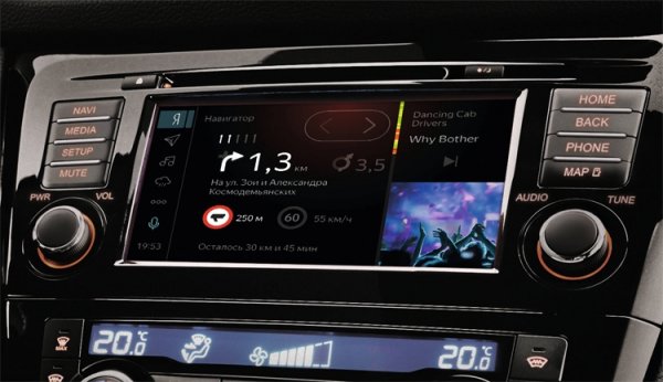 В случае моделей Qashqai и X-Trail взаимодействовать с сервисами «Яндекса» можно через 8-дюймовый сенсорный дисплей бортовой медиасистемы. В составе информационно-развлекательного комплекса задействован четырёхъядерный процессор, работающий в тандеме с 2 Гбайт оперативной памяти.