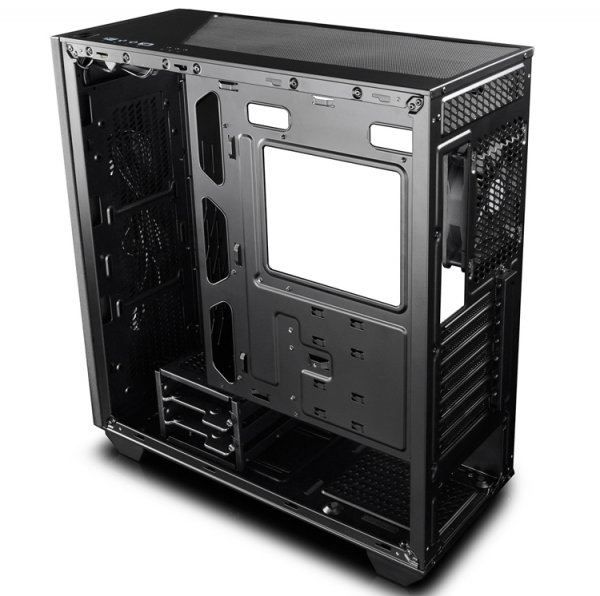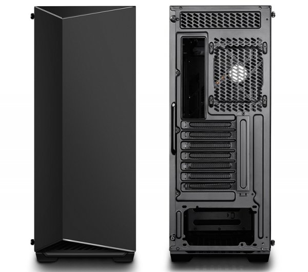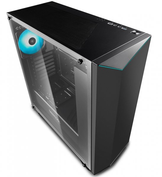 Новинка, выполненная в чёрном цвете, получила боковую стенку из закалённого стекла. Фронтальная панель изготовлена из металла толщиной 1 мм. В верхней части имеется V-образная светодиодная RGB-полоса. Кроме того, в тыльной части изначально установлен 120-миллиметровый вентилятор с многоцветной RGB-подсветкой.