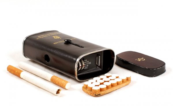 Среди других лотов, выставленных на аукционе, — камеры, замаскированные под портсигар, зонт, чемодан, дамскую сумочку и ручной фонарь. Одну камеру встроили в мужскую куртку: объектив замаскирован под пуговицу, а кнопка спуска спрятана в кармане.