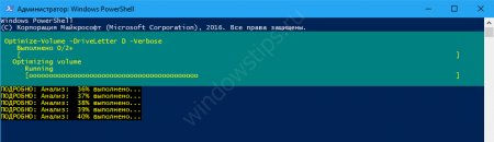 - Вводим Optimize-Volume -DriveLetter D -Verbose и ждем окончания процесса.