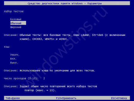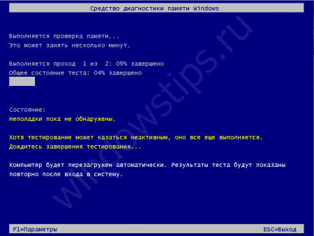 Тестирование осуществляется только при перезагрузке компьютера, когда нет значительной нагрузки на «оперативу» со стороны Windows и сторонних приложений. Средство диагностики выполняет несколько проходов для выявления ошибок. Интерфейс данного средства примитивен и напоминает MS-DOS или некоторые версии BIOS.
