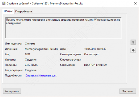 Результаты будут доступны по источнику MemoryDiagnostics-Results. Там будет написано или отрицательный результат поиска ошибок или же они будут найдены.