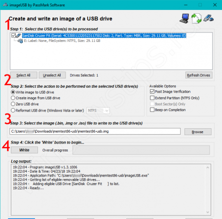 - Затем выберите нужную флешку (1), выберите «Write image to USB drive» (2), укажите путь к img образу утилиты (3) и нажмите «Write» (4) для начала записи.