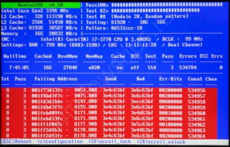 Во время теста, могут появляться красные строки с адресами ошибок. Чем их больше, тем хуже. Если в процессе тестирования у вас они возникнут, перейдите к следующему этапу – отдельное тестирование планок ОЗУ.