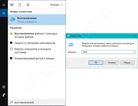 Наиболее удобный способ – это выполнить «откат» на этап до возникновения ошибки. В этом может помочь функция Восстановление системы. В поиске введите Восстановление и выберите соответствующую настройку или нажмите сочетание клавиш Win+R (окно Выполнить) и введите команду rstrui.