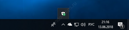 Для начала потребуется открыть Центр безопасности. Для этого отобразите скрытые значки или найдите в трее символ «Щита». В зависимости от состояния системы он может быть «красным» - есть угроза, «желтым» - уведомление или предупреждение и «зелёным» - всё отлично. Для открытия нажмите дважды на иконку.