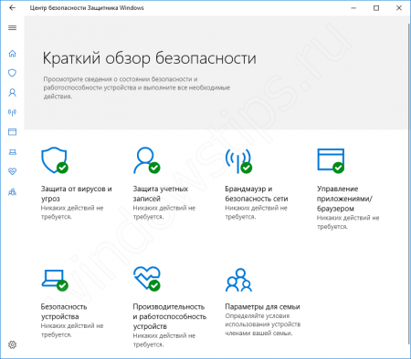 В обновлении Creators Update (версия 1703) появилось новое приложение, включающее в себя основные параметры безопасности устройства – Центр безопасности. Он включает в себя защиту от вирусов и угроз, параметры учетных записей и семейного доступа, настройки брандмауэра, безопасности и многое другое.