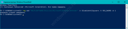 - Скопируйте следующую команду. Чтобы Defender заработал, значение /d должно быть равно 0 или если Вы хотите его выключить – 1.