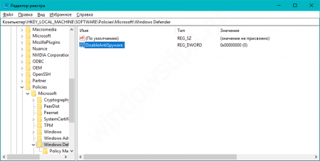 Некоторое программное обеспечение для отключения телеметрии Microsoft может заодно и отключить встроенный антивирус. В реестре создаётся значение с параметром DisableAntiSpyware, который и мешает корректной работе службы. Даже когда не запущена служба защитника Windows 10, как включить её вы можете узнать далее.